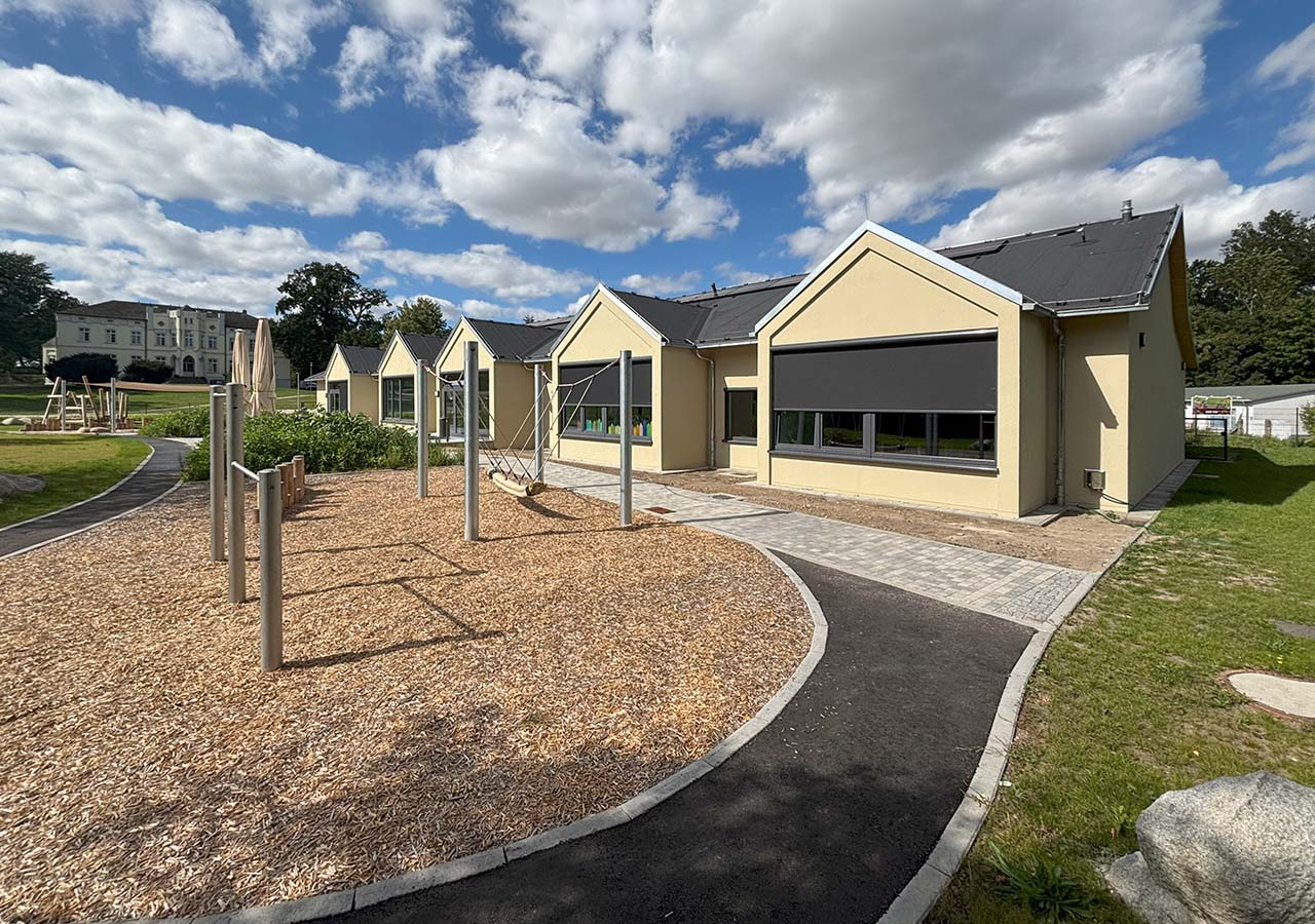 Der Hort der Regionalen Grundschule in Mühlen-Eichsen wurde im Rahmen einer umfassenden nachhaltigen Sanierung modernisiert und an die heutigen Anforderungen an Komfort, Energieeffizienz und Funktionalität angepasst. In den neu gestalteten Räumlichkeiten finden nun bis zu 88 Kinder Platz zum Lernen, Spielen und Entdecken. Ein wesentlicher Bestandteil des Sanierungskonzepts ist ein wirkungsvoller Sonnenschutz – umgesetzt mit hochwertigen ZIP-Screens.
